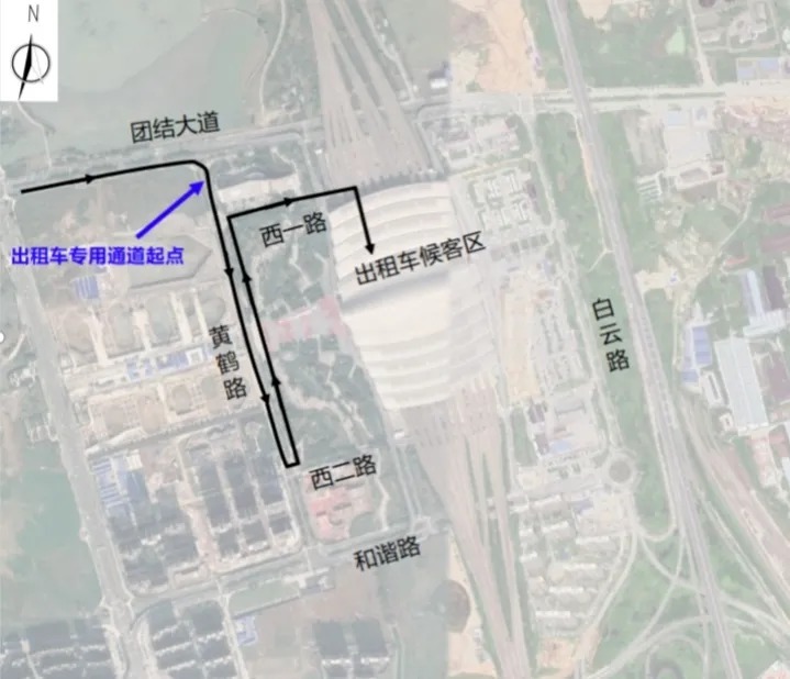 原出租车进站通道(由和谐路右转驶入黄鹤路,总长约870米)调整为:统一由团结大道右转进入黄鹤路,在黄鹤路与西二路路口掉头后进入西一路,通道总长约1500米。